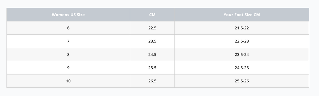 - Refer to the size chart eg. If your foot measures 22.5cm in length, then choose size US7.
