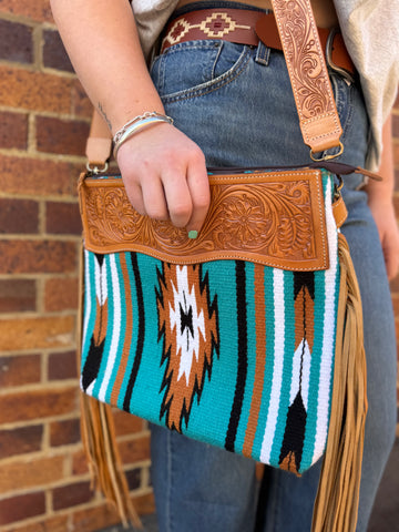 This striking Tooled Saddle Blanket Bag with intricate hand tooled details adds touch of bliss and enthusiasm to your everyday life. Hand Tooling details on the front panel and a long adjustable strap with tooling details, leather fringes on the sides and 100% Hand Woven Saddle Blanket Fabric makes this beauty the perfect confident.