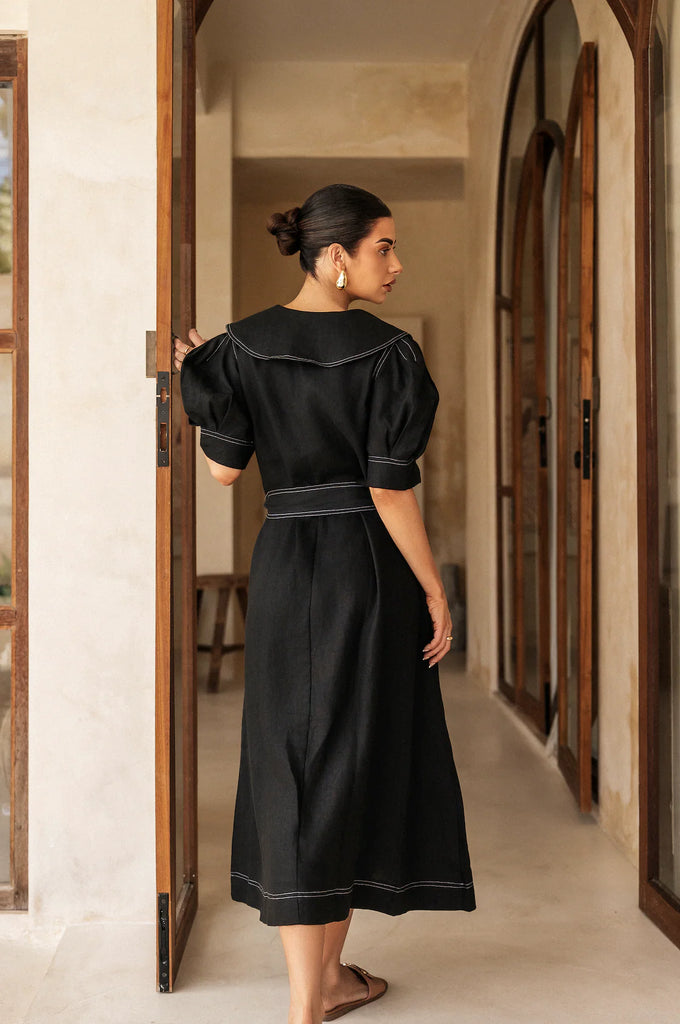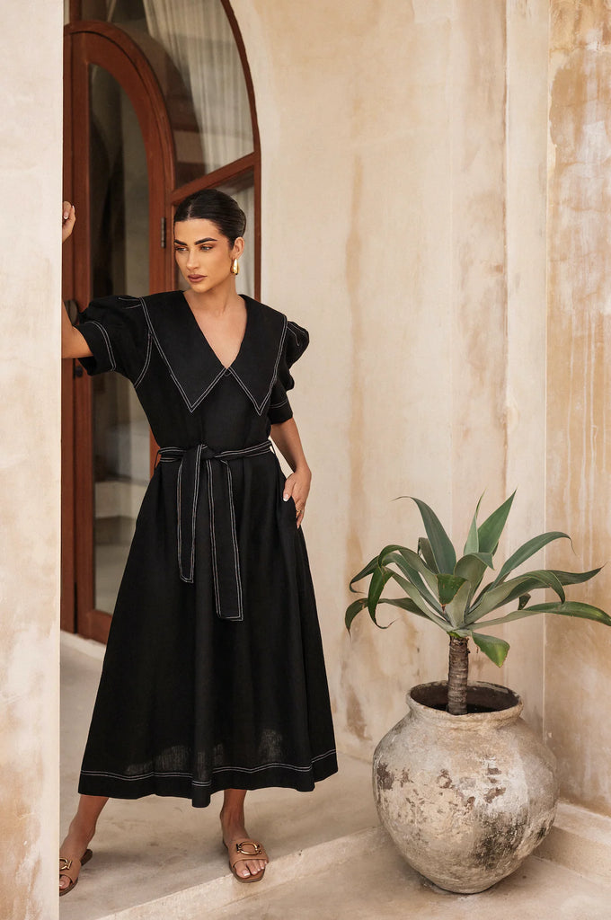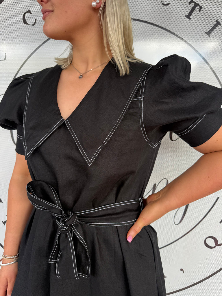 Featuring balloon puff sleeves and a distinctive V-neck Peter Pan collar with contrast stitching, the Camilla Dress delivers effortless charm with a modern edge. A self-tie linen waist belt offers shape and flexibility, while side pockets provide everyday practicality.