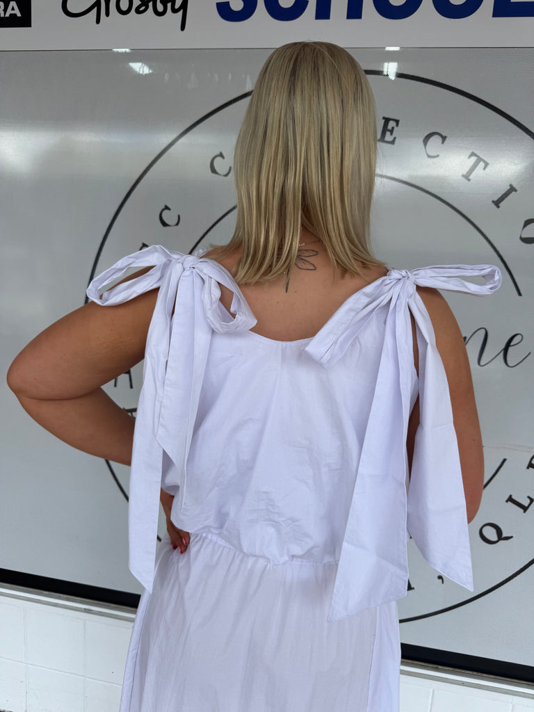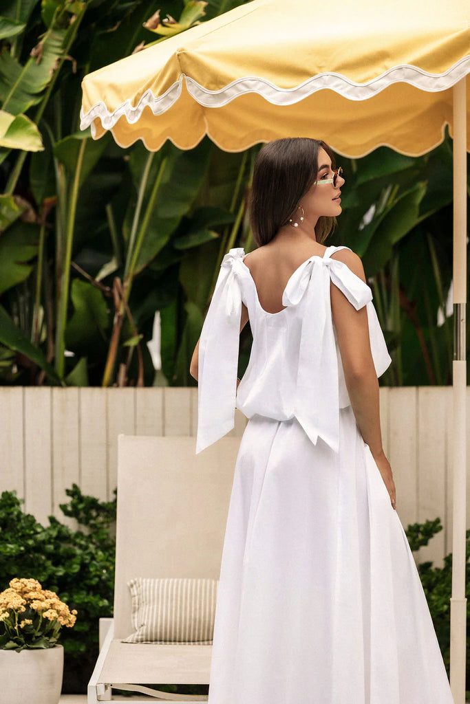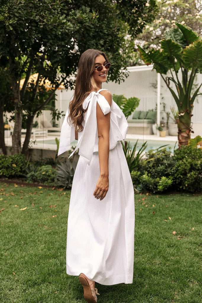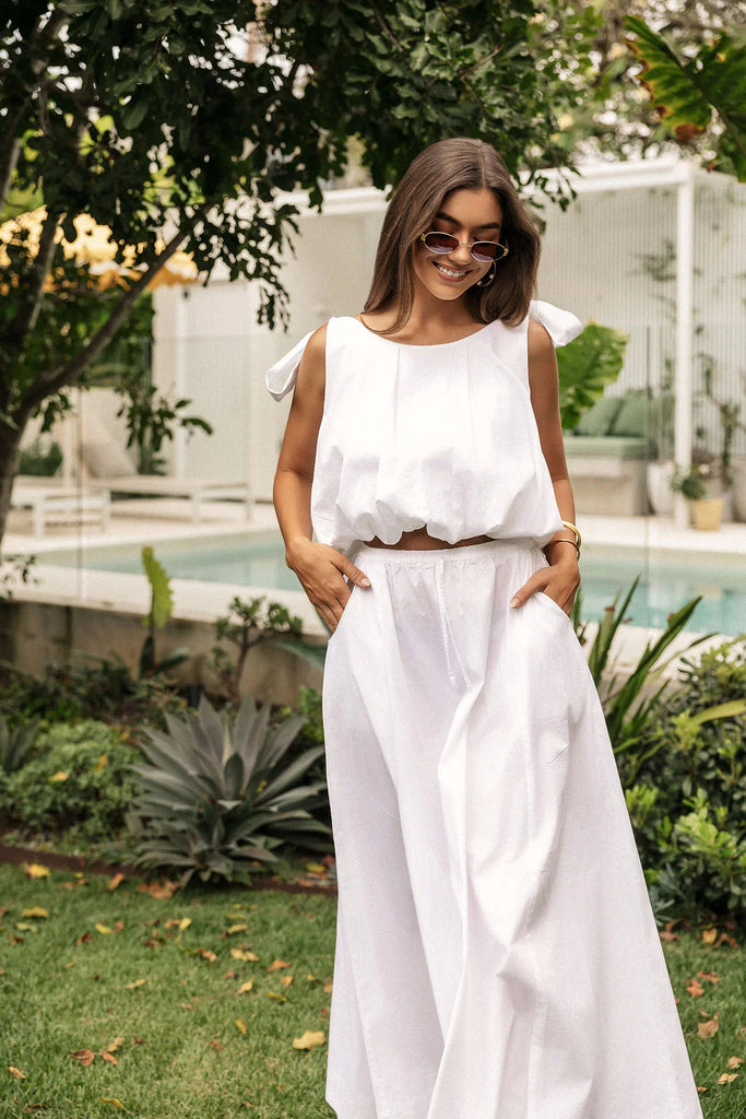 Effortlessly feminine, the LJC Mila Bubble Top in White Cotton is the perfect blend of playful detail and timeless design. Made from lightweight cotton poplin, this cropped top features a high scooped neckline with long tie straps for adjustable styling.