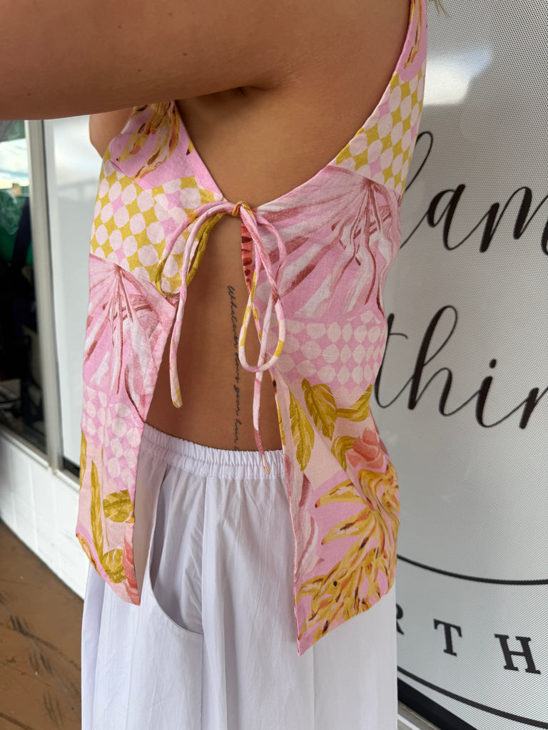 Fresh and fun, the LJC Siemma Top in Banana Printed Linen is a playful piece designed to stand out. Featuring a high round neckline and unique side splits with delicate spaghetti tie straps, this top blends minimal lines with eye-catching detail.