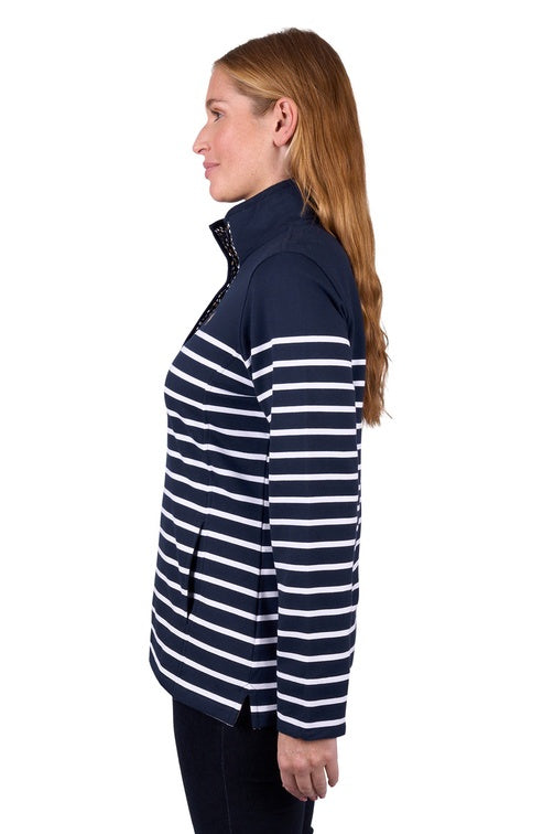 on inside collar and placket, button up collar, contrast stripe back neck facing, contrast taping on inside neck, front placket, sleeve cuffs and side seam splits, front princess seams with concealed pockets, metallic horseman embroidery on chest