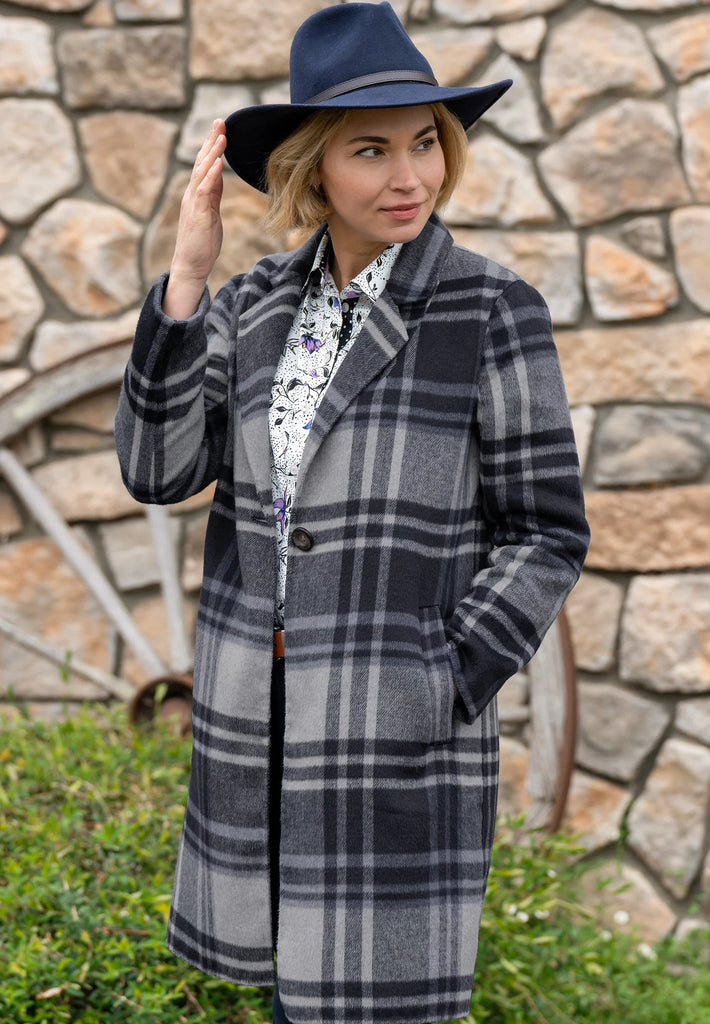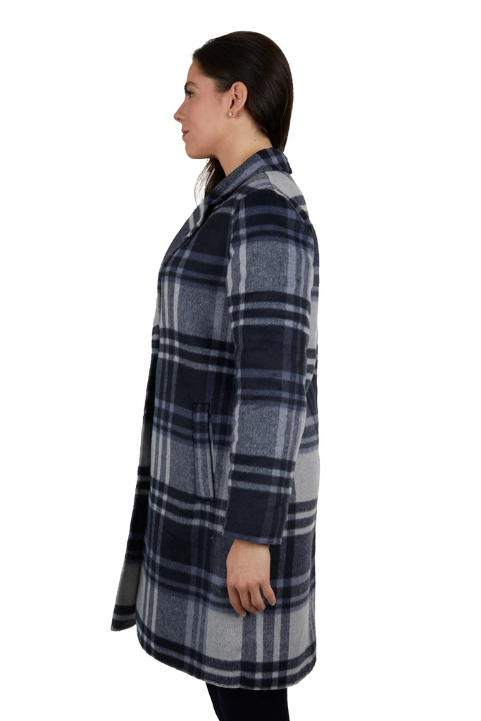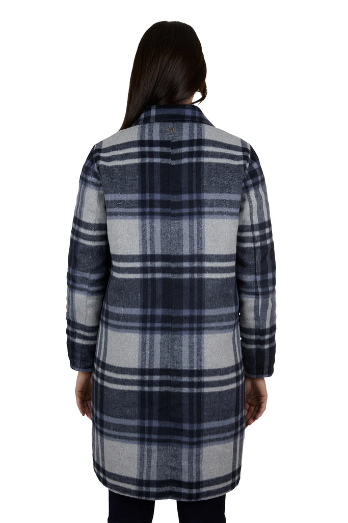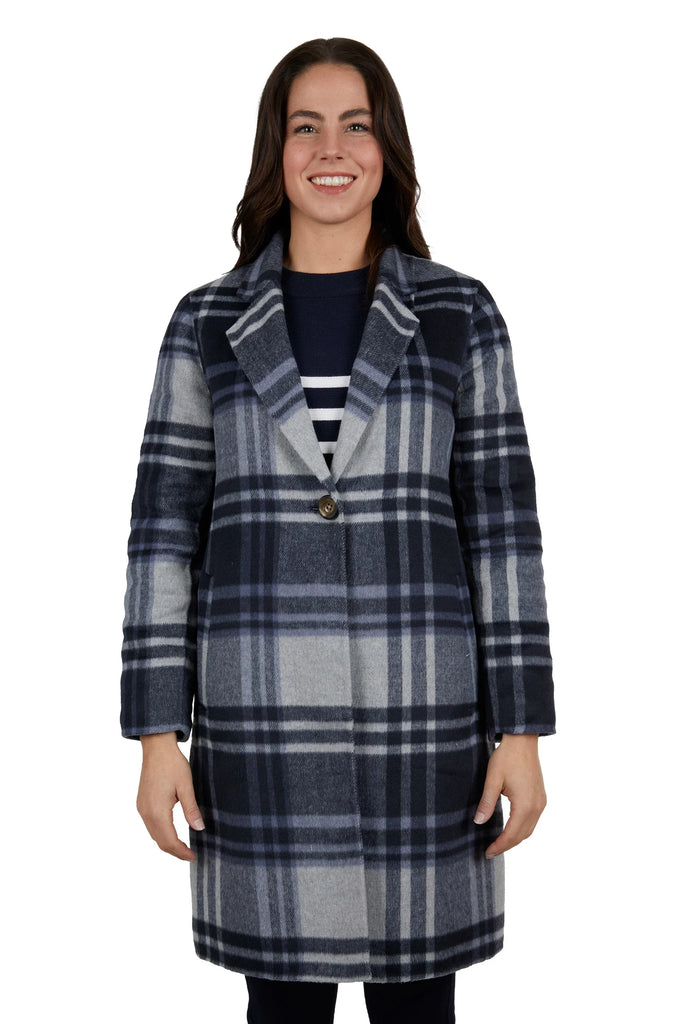 This wool blend longer line coat features a button opening and welt pockets, with the signature Thomas Cook script embroidery on the sleeve hem. Crafted with a blend of high-quality wool, this coat is perfect for any stylish and sophisticated woman. Its longer length provides added warmth and coverage, making it a practical and stylish addition to any winter wardrobe