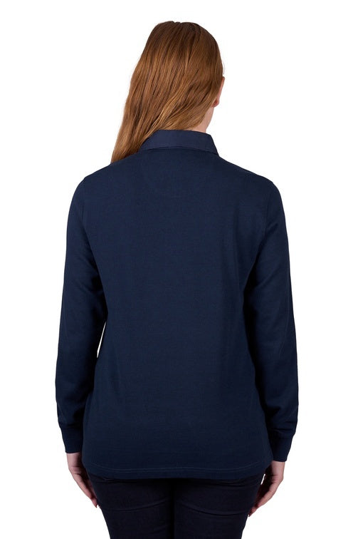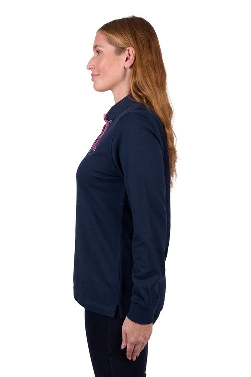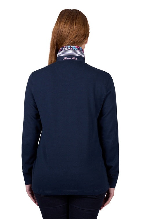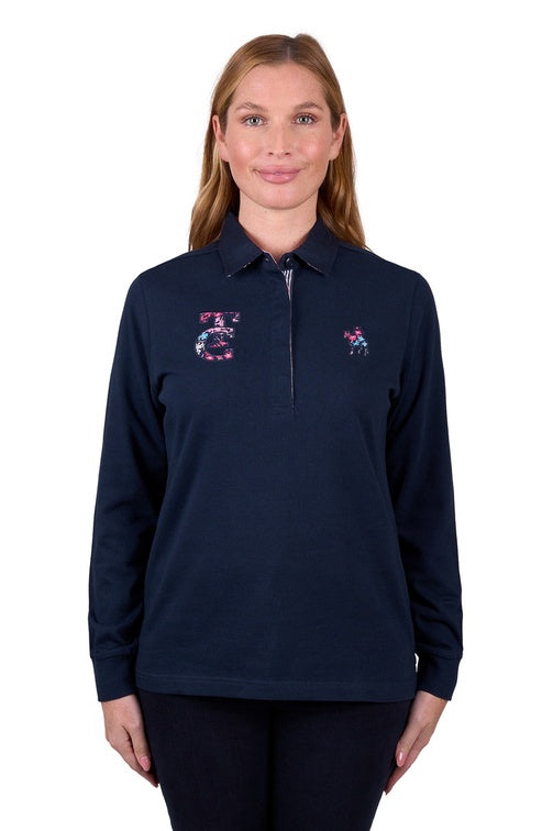 Heavyweight jersey knit rugby, long sleeves with rib cuffs, cotton drill collar, contrast placket with concealed buttons, internal neck printed taping, TC appliqué on chest, horseman embroidery on chest