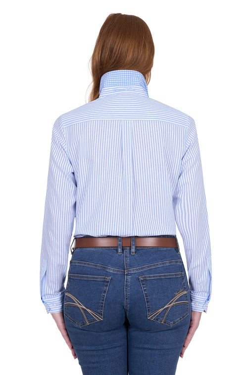 Linen blend yarn dyed stripe, breathable linen blend fabric to keep you cool, grosgrain taping on inside neck and sleeve cuffs, horseman embroidery on chest.