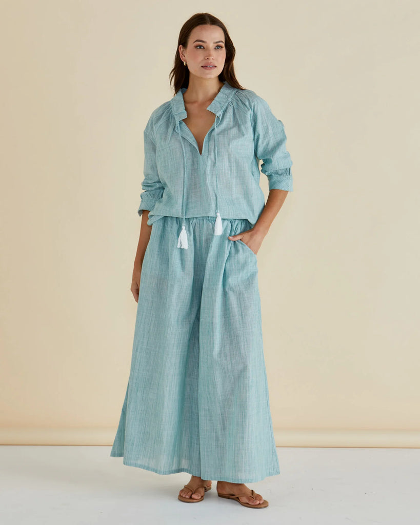 The Tatum Wide Leg Pant features handwoven cotton fabric with an elasticated waistband and wide palazzo leg. Practical pockets and mid-high rise create an elevated, comfortable silhouette. A classic, easy-to-wear pant ideal for transeasonal wardrobes.