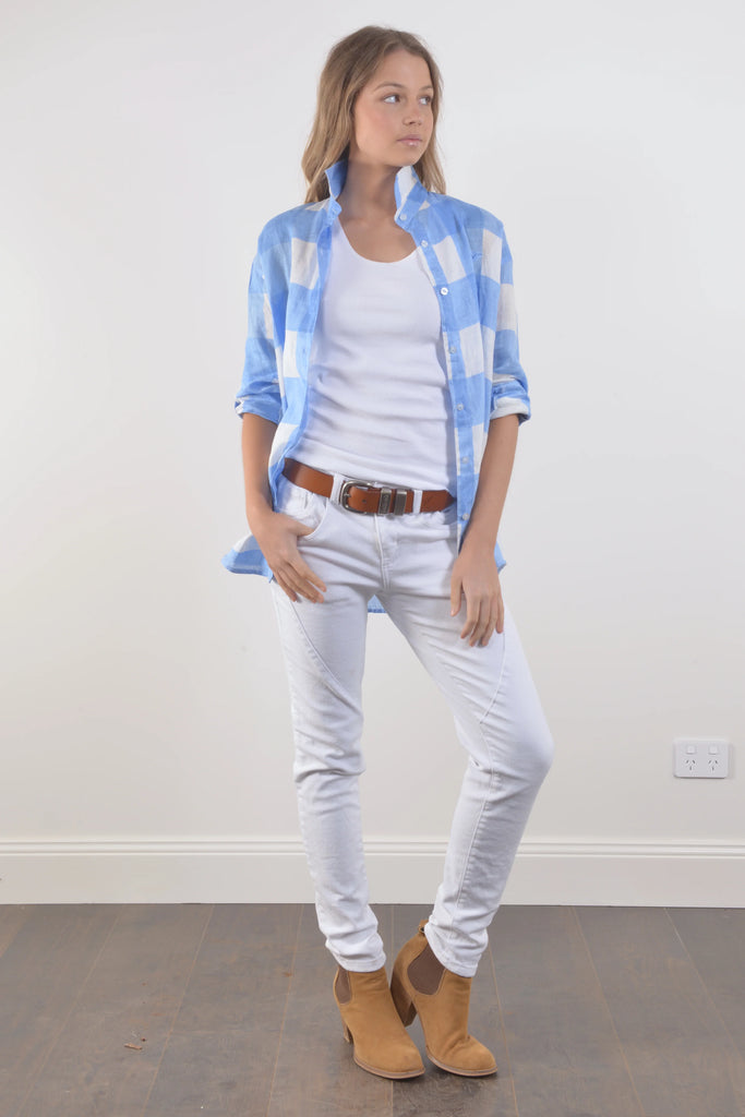 The Lightford Shirt by BullRush. Hand-printed for a unique touch, this boyfriend-inspired shirt features a loose, relaxed fit perfect for effortless dressing. Embrace the natural texture and breathability of linen in a timeless design. NEW COLOUR.