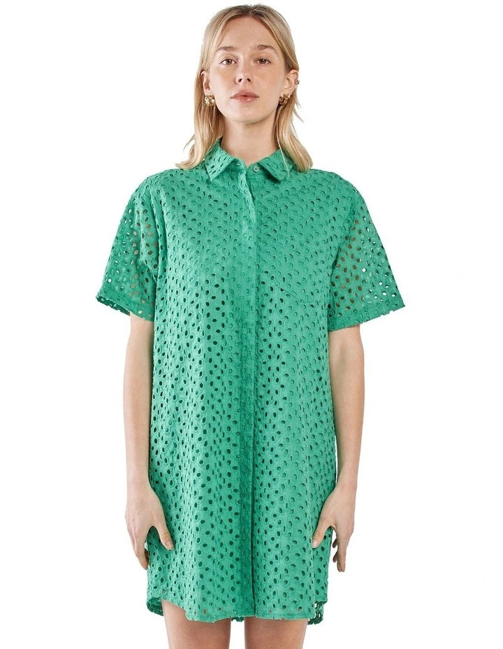 This one does it all. The Steva Shirt Dress has soft broderie, a curved hem, and concealed buttons for a polished finish. Lined where it counts and ready for summer.