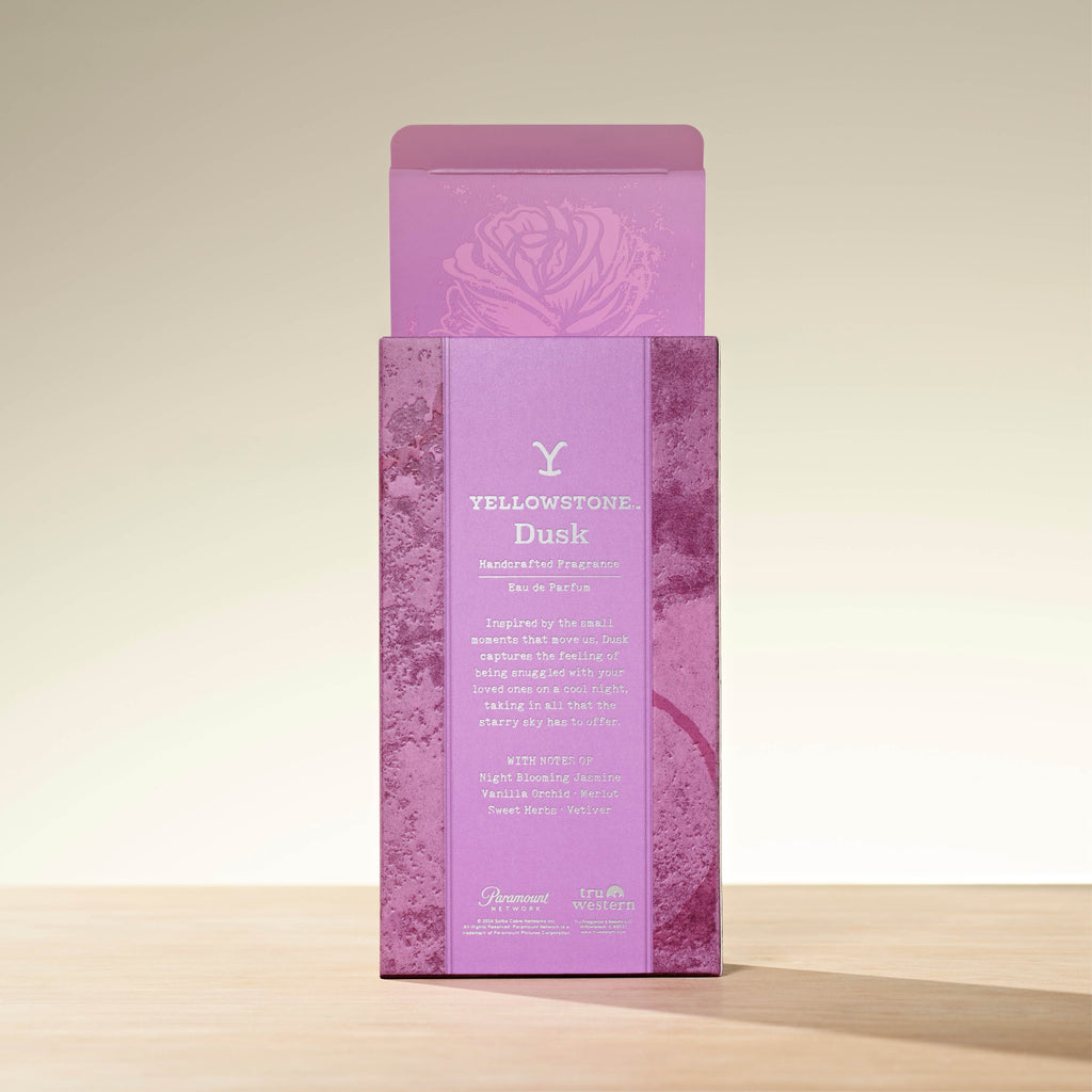 The packaging mirrors the fragrance within: the deep purple hue reflects the rich Merlot note, while the debossed "Y" on the bottle and the Yellowstone Y inlay on the wooden cap offer sophisticated finishing touches. This exquisite design elevates your experience, making each encounter with Dusk truly unforgettable.
