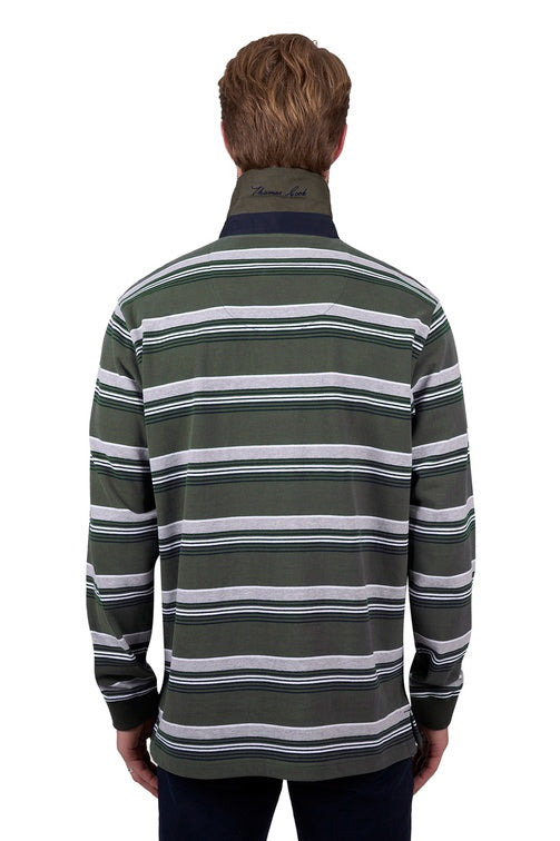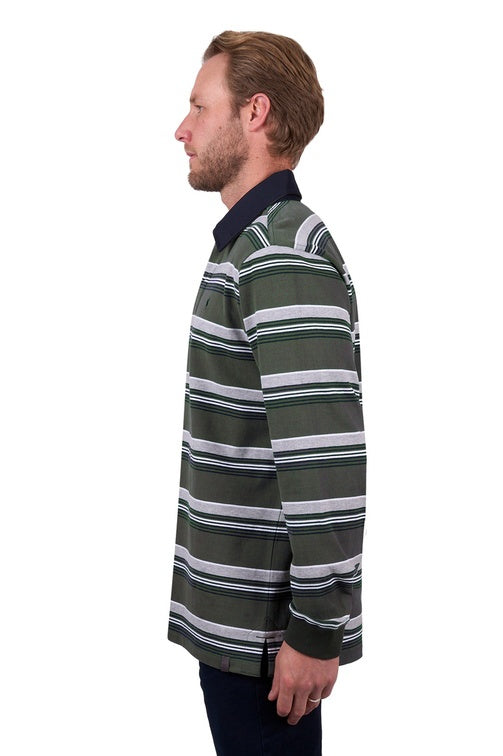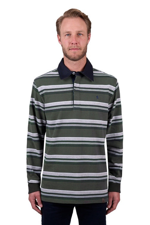 Heavyweight jersey knit rugby, long sleeves with rib knit cuffs, cotton drill collar with contrast underside, canvas tape placket with concealed buttons, contrast taping on inner neck and side seam splits, horseman embroidery on chest.