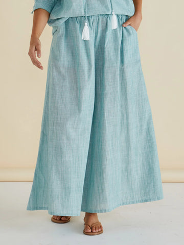 The Tatum Wide Leg Pant features handwoven cotton fabric with an elasticated waistband and wide palazzo leg. Practical pockets and mid-high rise create an elevated, comfortable silhouette. A classic, easy-to-wear pant ideal for transeasonal wardrobes.