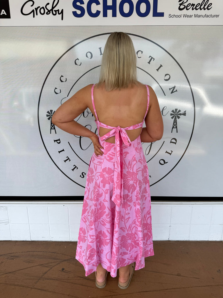 LJC Delilah Dress Printed Linen | Pink Hibiscus