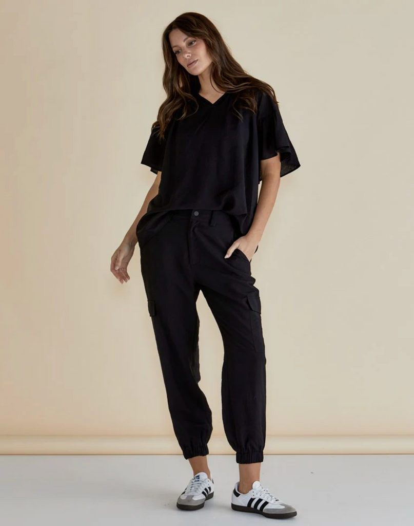 The Vivienne Blouse exudes effortless charm with its shirred mandarin collar, flutter sleeves, and relaxed drape. Raglan shoulder panels add a subtle yet refined detail to this chic piece.