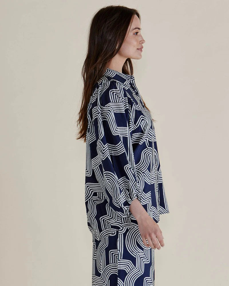Featuring ballooned sleeves with light gathers and a collar with buttons, the Rosalind Shirt blends elegance with a relaxed fit. The 3/4 sleeves with elastic cuffs add a sophisticated touch to this transeasonal staple.