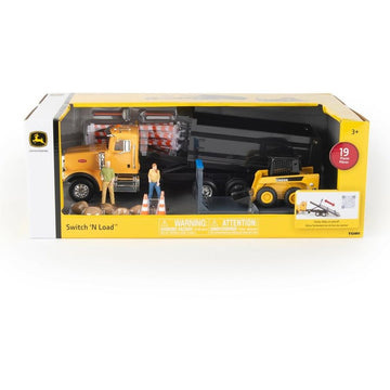 Switch it up for two fun ways to play! This Switch 'N Load Construction Playset gives kids a unique way to imagine themselves getting the job done. Depending on the task at hand, they'll need the proper load to get it done right. Switch the load on the Peterbilt semi to a flatbed to haul the included John Deere skid steer. It easily slides on and off and includes a vehicle holder to keep the skid steer steady during the drive. Need to haul some sand to the other side of the sandbox? Slide off the flat bed and switch over to the dump bed which has plenty of room for a large haul. In both modes, the back of the semi tilts up for easy loading and unloading. The John Deere skid steer also features working parts with a front arm that raises and lowers. This 19-piece set is ready to inspire creative play and also includes two standing figures that can hold and "use" the rake and shovel to help kids get the job done. Rocks, orange safety cones, and construction barriers add to the fun for a construction toy set that s sure to be a hit with young construction fans ages three and up.