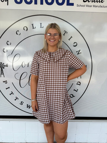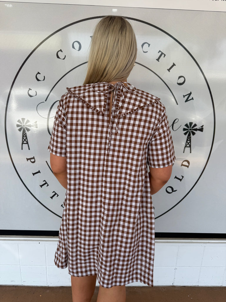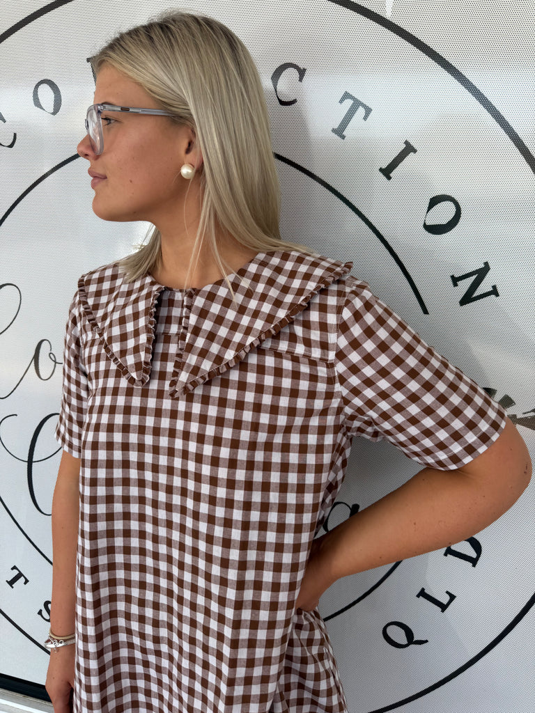 The star of the show is the oversized ruffle collar, adding a romantic, statement-making touch that frames the neckline beautifully. A tie-back detail adds subtle shaping at the back, while side pockets offer everyday ease. Finished in a chocolate gingham print, it’s the perfect blend of charming, comfortable, and effortlessly chic.