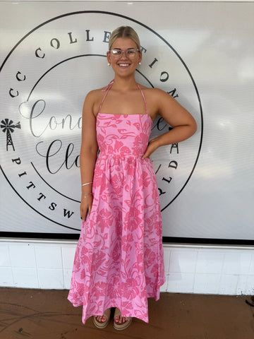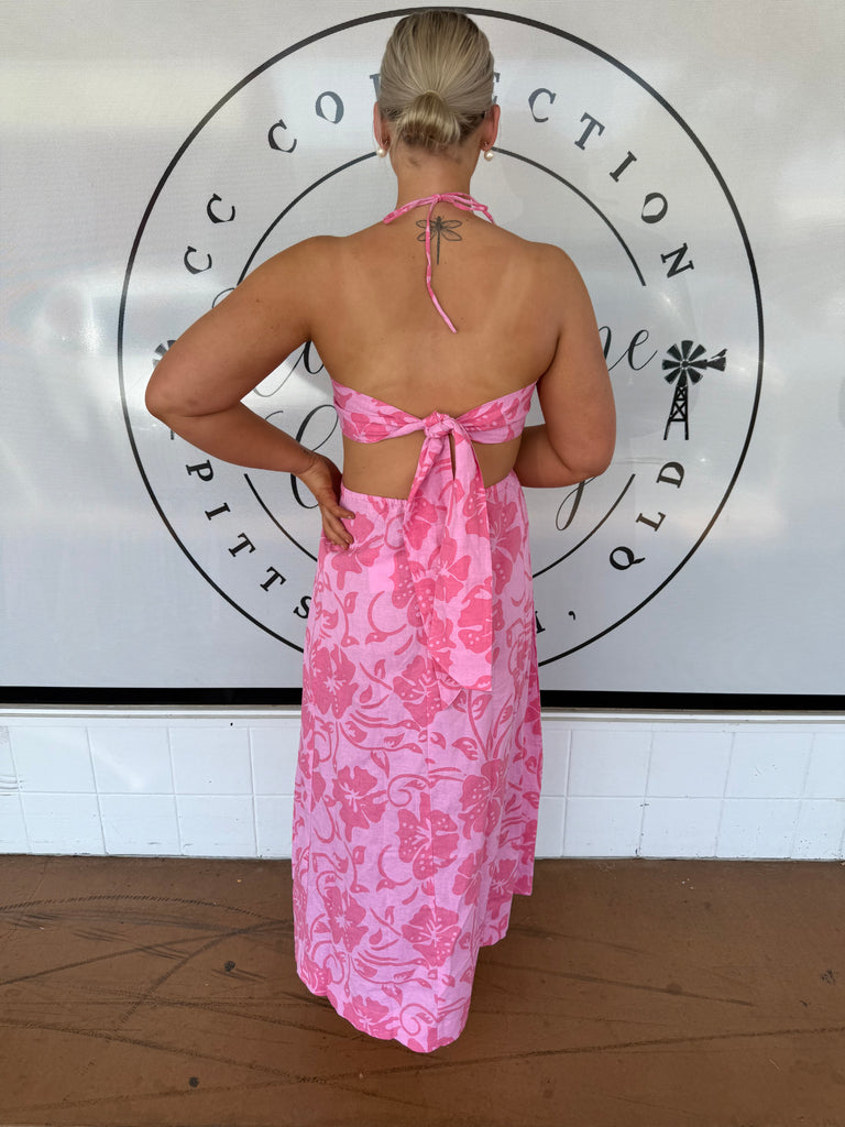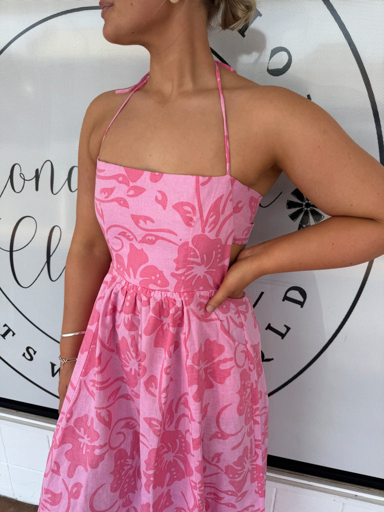 LJC Coolum Dress Printed Linen | Pink Hibiscus