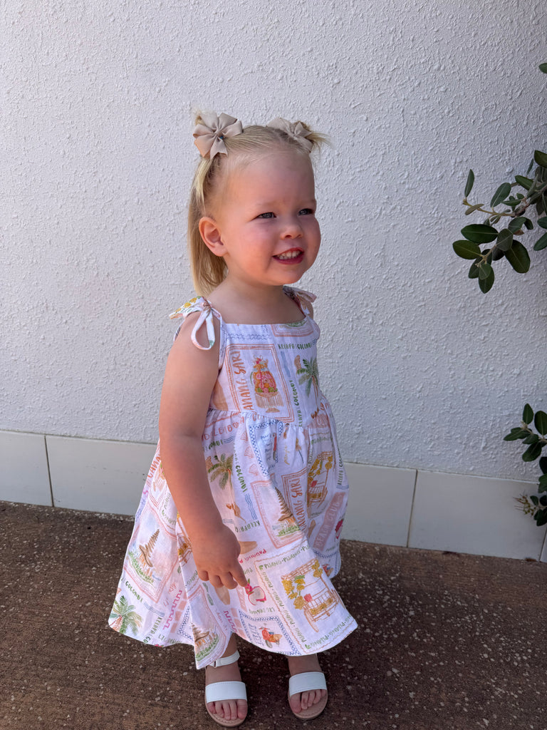Featuring adjustable tie shoulder straps, it offers an easy fit that grows with them, while the exclusive LJC Bali print adds a touch of coastal charm. Effortless, cute, and practical, the Paris Dress is a breezy must-have for the warmer months.